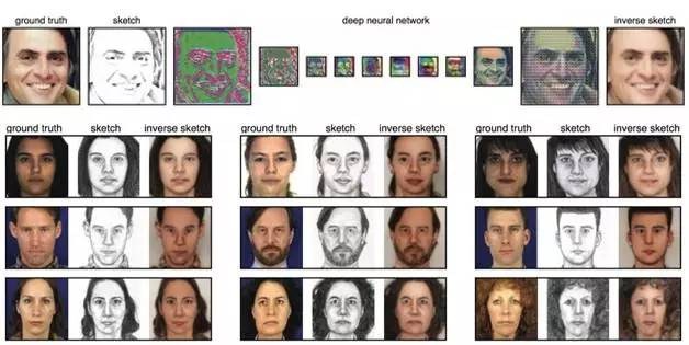 就在六月初,荷兰科学家在arXiv上发布了他们的最新研究成果——通过深度网络对人脸轮廓图进行“复原”。如图6所示,在模型训练阶段,首先对真实的人脸图像利用传统的线下边缘化方法获得对应人脸的轮廓图,并以原图和轮廓图组成的“图像对”作为深度网络的输入,进行类似超分辨率重建的模型训练。在预测阶段,输入为人脸轮廓(左二Sketch),经过卷积神经网络的层层抽象和后续的“还原”操作,可以逐步把相片般的人脸图像复原出来(右一),与最左边的人脸真实图像对比,足够以假乱真。