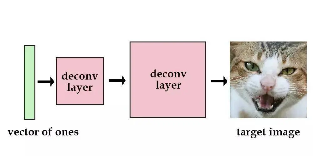 假设有一个由数层解卷积层构成的神经网络,我们把输入设定为单位向量,然后训练该网络去降低其与目标图像之间的均方误差。这样,该图像的“数据”就包含在神经网络当前的参数之中了。