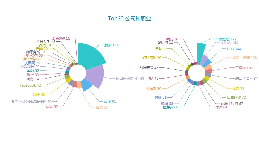Top20 公司中BAT、网易、华为、小米科技、美团网以及谷歌、Facebook、微软等大厂都悉数在列。再看Top20 职业里除了各种名号的程序员、产品经理、运营等互联网职业,创始人、CEO等占据前排,不可谓不令人大惊从早到晚失色。