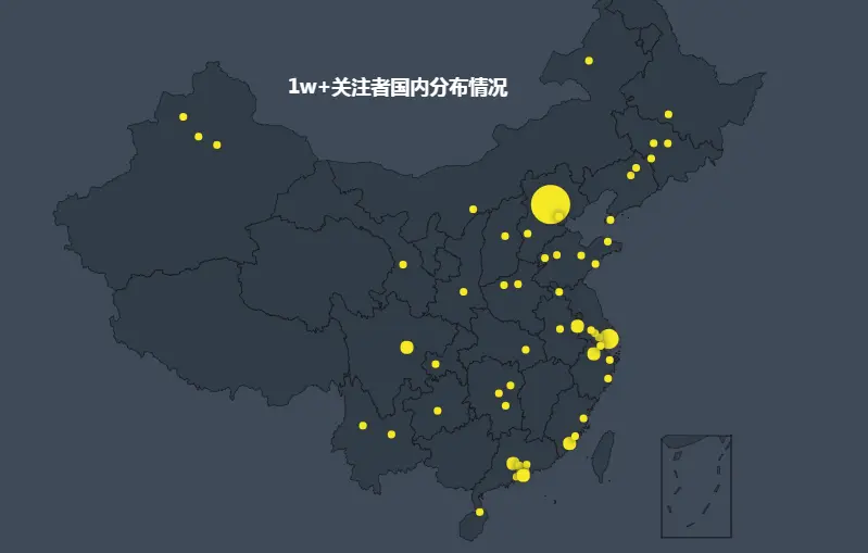 由于第一次处理这类数据并可视化,第一次用Echarts就打算画这个酷炫的地图,因此最终先缩小数据量,还是以1w+大V的数据来可视化,目前先完成国内分布情况,以后看情况再扩大数据量和绘制全球分布情况。