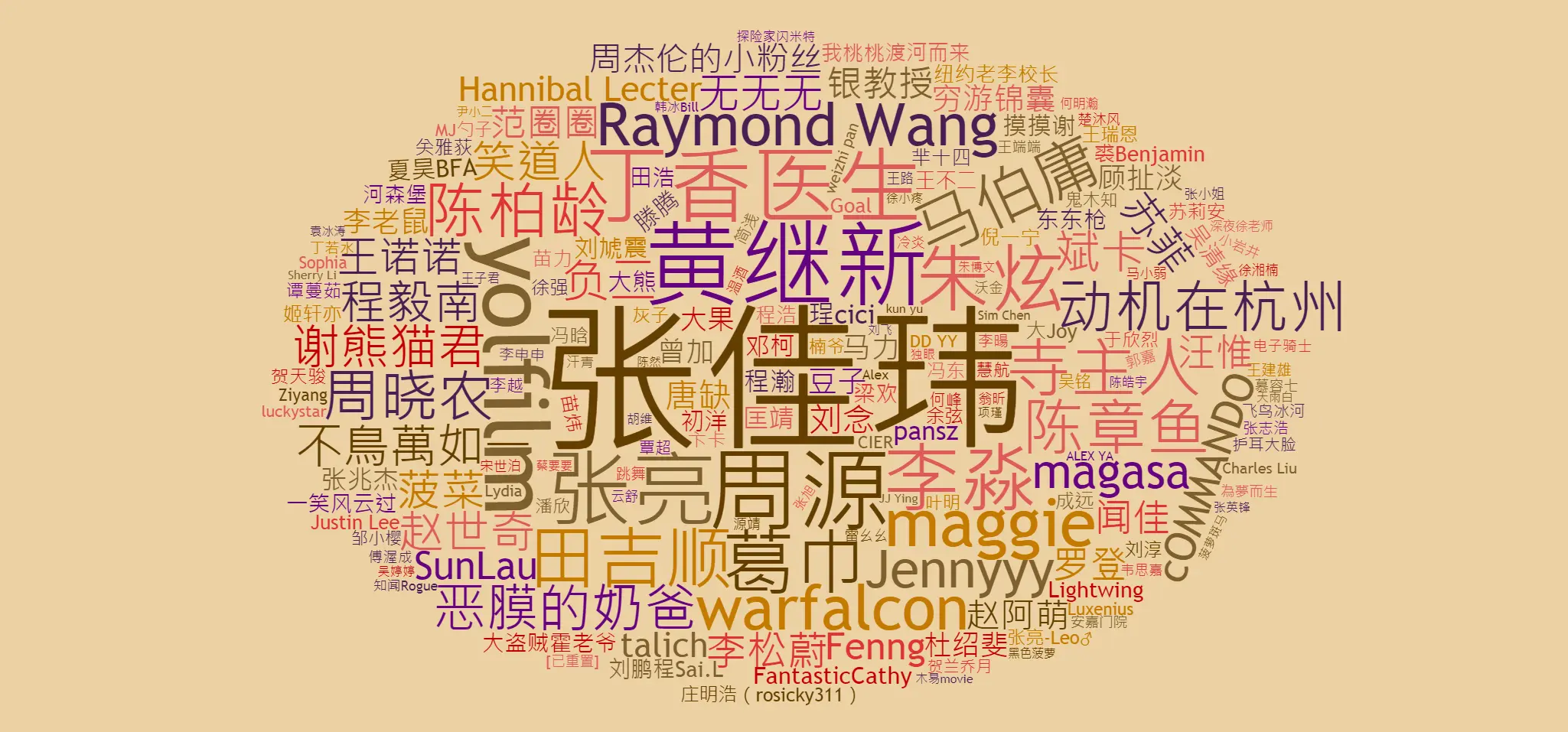 前文已多次提到10w+大V,那么这190人里到底都有谁呢?这里以关注人数为权重,生成词云如下: