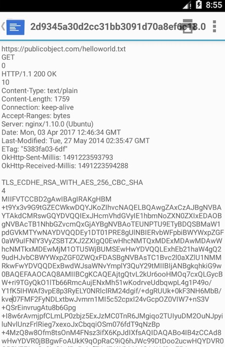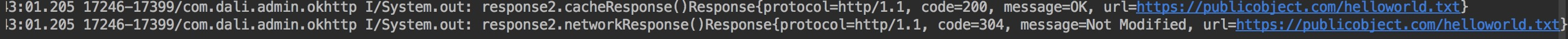 可以在控制台看到打印的数据,第一次请求网络 cacheResponse 为 null,networkResponse 请求成功。第二次 cacheResponse 可以看到是从缓存获取的数据。在 networkResponse 中显示的是 304,这一层由 Last-Modified/Etag 控制,当用户请求服务器时,如果服务端没有发生变化,则返回 304.
