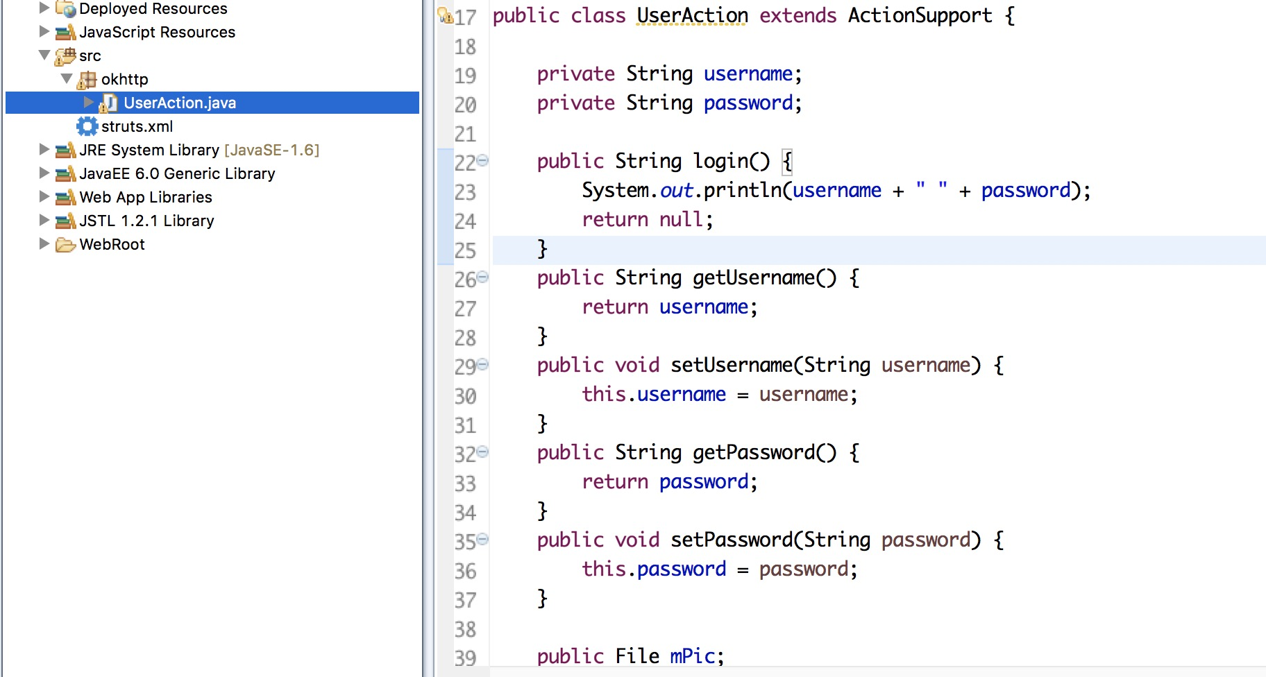 在 src 下创建一个类继承 ActionSupport,编写代码,这里为了简单演示一下,定义了两个成员变量和一个方法,获取服务端的用户名和密码。