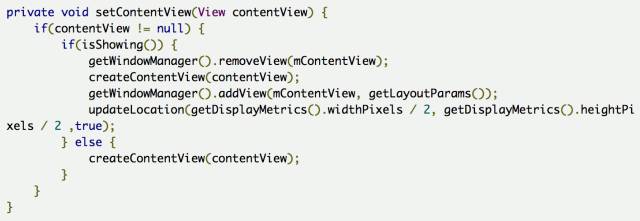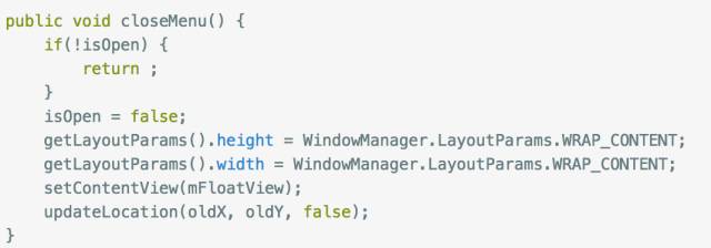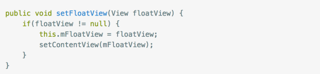 首先,floatView的设置非常简单。至于setContentView(mFloatView),是因为悬浮窗默认首先显示的是小窗口,所以在设置MenuView的时候,就将窗口的布局设置为floatView。