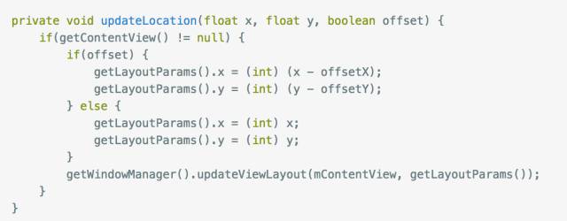 在视图切换中用到了窗口的移除和窗口的添加,而在位置更新中用到的是WindowManger三个方法中的第三个方法窗口更新,通过传入我们需要重新设置WindowManager.LayoutParams中的x、y位置坐标,然后更新窗口,就能实现窗口位置的更新操作。