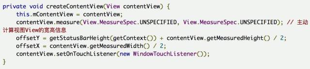 由于我们要实现的悬浮迷你音乐盒,是需要在两个视图之间进行切换的,所以在每次视图切换之前,我都会对先要加载的视图进行一个准备,由代码contentView.measure(View.MeasureSpec.UNSPECIFIED, View.MeasureSpec.UNSPECIFIED)可以看到,主动计算出当前View的宽高信息,还有就是 getStatusBarHeight(getContext())计算设备状态栏高度的方法,因为在窗口移动的时候,默认x、y指定的是窗口左上角的坐标,这样就涉及到一个偏移量的问题,在排除偏移量问题后,我们的坐标就会精确指定窗口的正中心。而且在代码中能够明显看出,我对contentView设置了一个onTouch触摸事件,主要是实现窗口的滑动,具体实现在后面会有介绍。