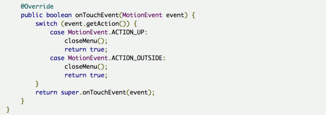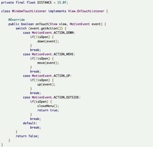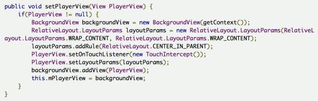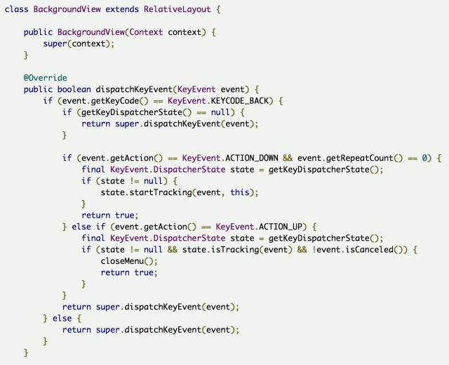 menuView的设置相对于floatView的设置复杂一些,大家可以看到,我为添加进来的MenuView包裹了一层BackgroundView,而这一点正是从PopupWindow的源码中借鉴而来,BackgroundView是一个自定义内部类,继承至RelativeLayout,并且重写按键点击监听事件和触摸事件,主要是用于PlayerView的返回键关闭功能和外部点击关闭功能。