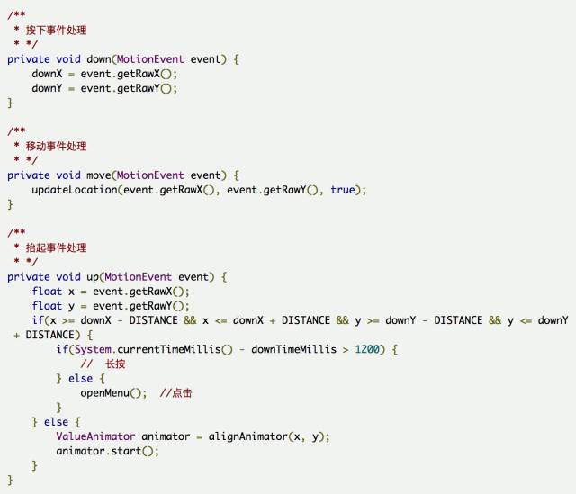 floatView的触摸监听事件非常简单,就是根据手指触摸的坐标位置实时刷新窗口的坐标位置,当up坐标和dowm坐标的区域在预先设置好的合理范围内,触摸事件超过1秒钟则视为长按事件,小于1秒钟则视为点击事件,移除floatView,添加playerView。注意区别MotionEvent的getX、getY和getRawX、getRawY方法,getX、getY点击位置在视图内的坐标,getRawX、getRawY则是点击位置相对于整个屏幕的坐标
