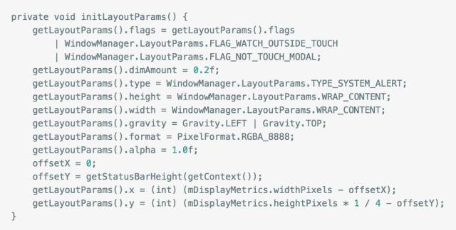 WindowManager.LayoutParams控制着窗口显示的策略,因此在窗口显示之前,我们要完成对WindowManager.LayoutParams的配置。由上面的代码看出,窗口类型是系统提示窗口,也就上篇文章中说到的可以显示在任何视图之上的那种窗口类型,窗口的宽高是自适应。对齐方式是左上角对齐。窗口的透明度为1.0,也就是不透明。虽然窗口并没有设置属性FLAG_NOT_FOCUSABLE,也就是说我们的窗口默认是设置焦点的,但是由于我设置 FLAG_WATCH_OUTSIDE_TOUCH属性的缘故,窗口外的区域,还是能够自由接收点击触摸事件的。