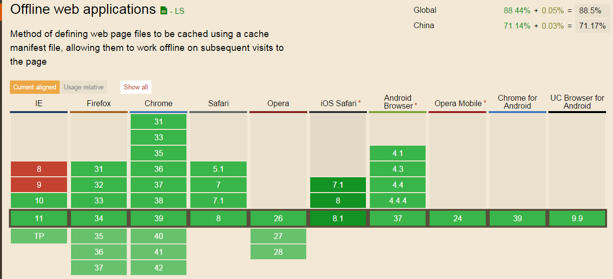 所有主流浏览器均支持应用程序缓存,除了 Internet Explorer。caniuse给出的答案如下图所示。