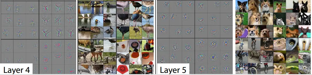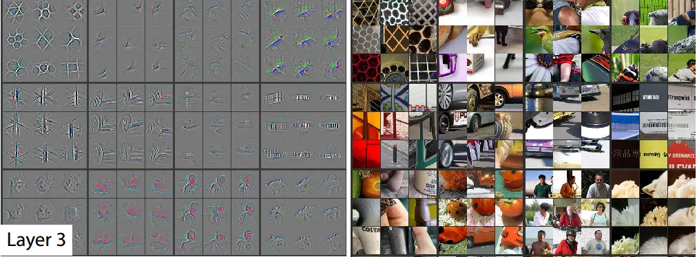 在第三层中,我们可以看到模型已经开始学习一些更具体的东西。第一个方块中的图像表明模型已经能够识别出一些地理特征;第二排第二列的方块表明模型正在识别车轮;倒数第二个方块表明模型正在识别人类。