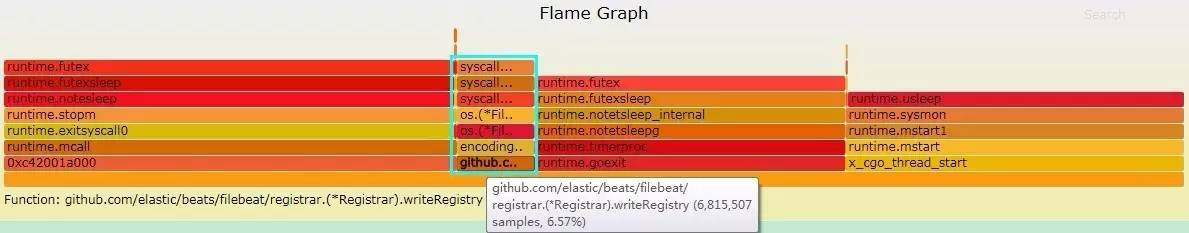 我还不能完全解读这张图,但是已经可以明显看到,对Registry文件(Filebeat用于记录文件采集列表和offset数据)的写操作占了一定比例。于是,尝试将Filebeat的spool_size(每完成这么多条日志更新一次Registry文件)设置为10240,默认值的5倍,运行测试cpu已经可以跑到95%以上。而将Registry设置到/dev/shm/下也同样可以解决测试时cpu跑不满的问题。