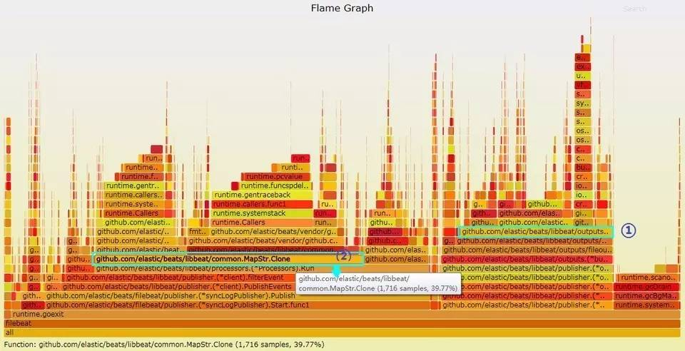 这时common.MapStr.Clone()从图中已经几乎找不见了,证明花费的cpu时间已经可以忽略不计。
