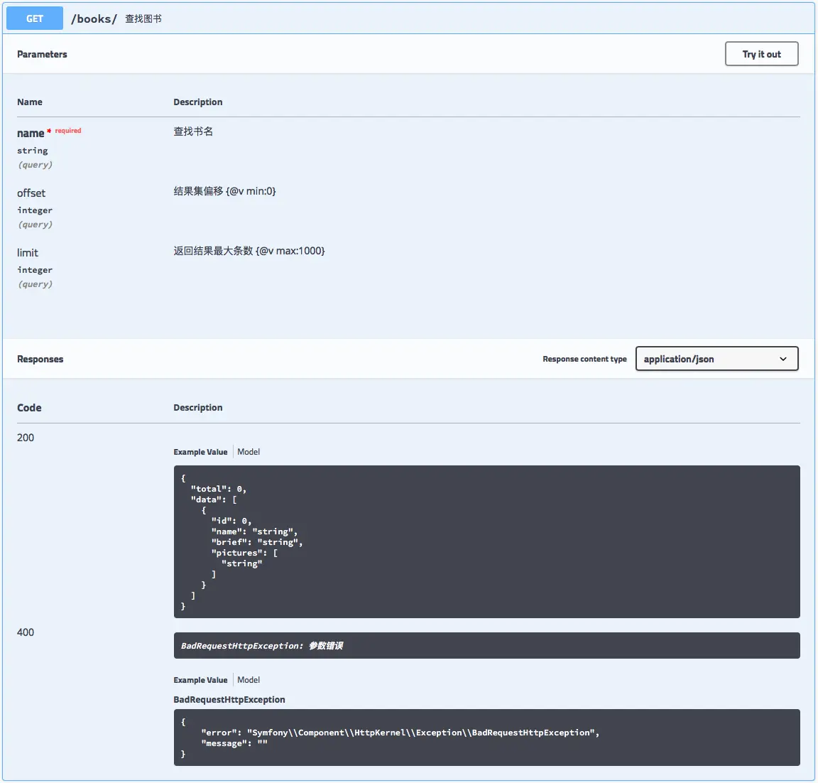 Swagger是目前最流行的接口文档框架。虽然很多框架都可以通过扩展支持Swagger, 但一般不是需要编写很多额外的注释, 就是只能导出基本的路由信息, 而不能导出详细的输入输出参数。而 PhpBoot 可以在不增加额外编码负担的情况下, 轻松去完成上述任务,下图为findBooks对应的文档。更多内容请见文档和 在线 Demo。