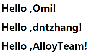 Omi.tag('hello', Hello)把组件变成可声明在其他组件中的标签,即:<hello></hello> - 通过