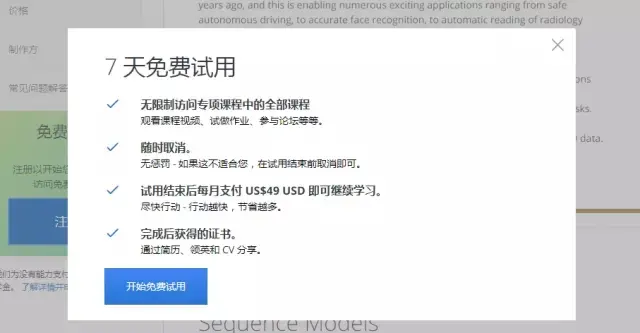 课程将按月费收费,每月49美元。不过,根据Coursera的规则,用户申请的在线课程,前7天里可以无限量访问。