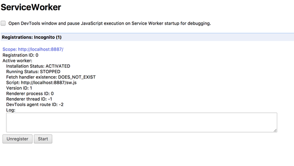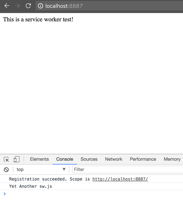 我们再直接打开 localhost ,打开控制台,发现只有 Registration succeeded. ,而没有了 test ,再看两个调试页面,发现 sw.js 没有运行。
