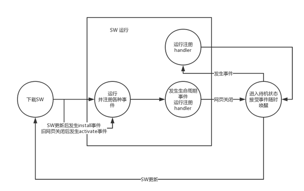 更新 SW 的机制可以在MDN上的 #更新你的Service Worker 这章看到,但这仅仅几行文字,而且比较绕口,我认为这其实是SW自身的工作周期,或者说是运行机制