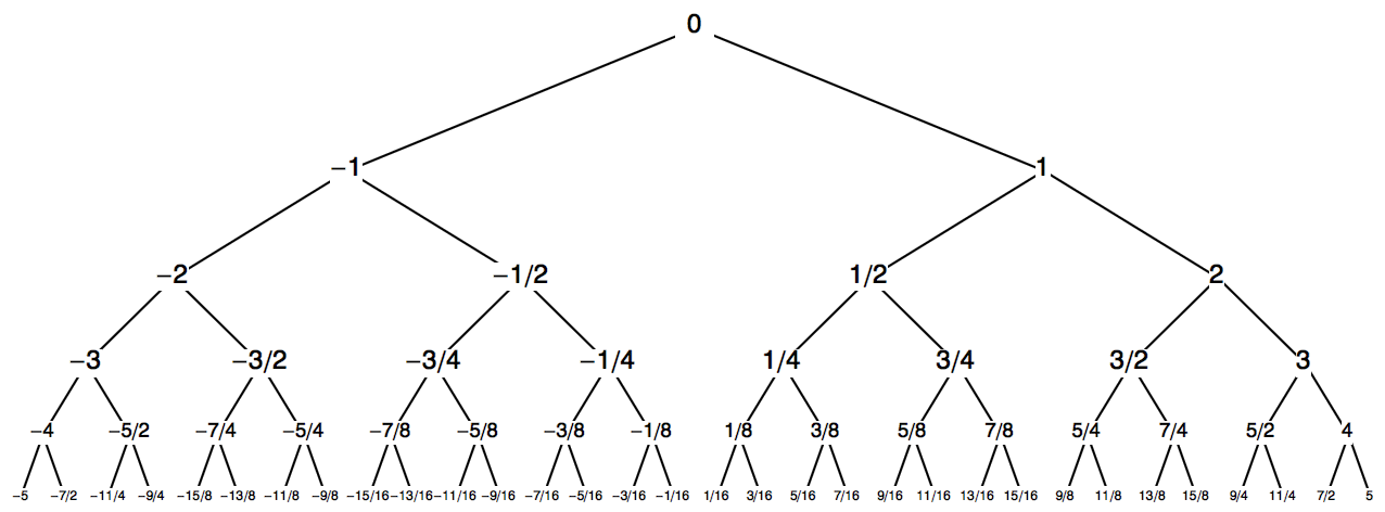 由之前证明过的补充性质 1 和补充性质 2 可知,用左右集合表达出来的数,其数值一定大于左集合里的最大数,小于右集合里的最小数。事实上,可以证明,这个数值一定就是下图所示的树里所有大小夹在左右集合之间的数中最上层的那一个。图中所示的树只画了前面几层,实际上这棵树会无穷伸展下去。