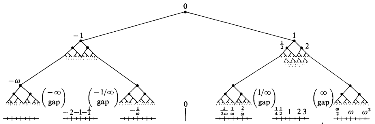 更奇怪的则是 {0, 1, 2, 3, … | ω} ,它将等于 ω – 1 ;而 {0, 1, 2, 3, … | ω, ω – 1} 则等于 ω – 2 。那么, {0, 1, 2, 3, … | ω, ω – 1, ω – 2, … } 呢?它将等于 ω/2 。而 {0, 1, 2, 3, … | ω, ω/2, ω/4, ω/8, … } 将会带来 √ω 。当然,从另一个方向上看,我们还有 { | 0, -1, -2, … } ,它显然应该等于 -ω 。别忘了,作为一个有序域,每个数不但都有自己的相反数,还有自己的倒数。 {0 | 1, 1/2, 1/4, 1/8, …} 将等于 1/ω ,直观地说也就是无穷小量。 {0 | 1/ω} 则等于 1/(ω · 2) ,而 {1/ω | 1, 1/2, 1/4, 1/8, … } 则等于 2/ω 。我们刚才创造的所有数都是合法的,它们确实都是一个个的数,它们依旧能比较大小,依旧能参与运算。不过,它们明显超出了实数的范围。看来,一个有序域完全有可能比实数域更大。
