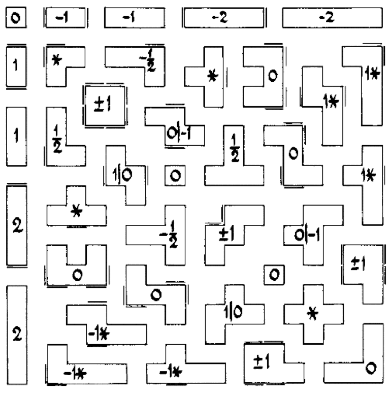 大家可以立即看出,它并不是一个合法的数。在 On Numbers and Games 中, Conway 建议用符号 ∗ 来表示这种特殊的棋局 {0 | 0} 。棋局 ∗ 扮演着很重要的角色,例如不难验证等式 ∗ + ∗ = 0 成立。Conway 用符号 ↑ 表示棋局 {0 | ∗} ,容易看出这是一个左玩家必胜的棋局。可以证明,存在等式 {0 | ↑} = ↑ + ↑ + ∗ 。可见,这个里面的水非常地深,继续挖掘下去还大有文章可作。在书中, Conway 还分析了很多其他的游戏以及其他的棋局运算,感兴趣的朋友不妨深入阅读下去。下面这张漂亮的图片来自 Winning Ways for Your Mathematical Plays 一书,直观地展示了各种各样的棋盘及其对应的数。