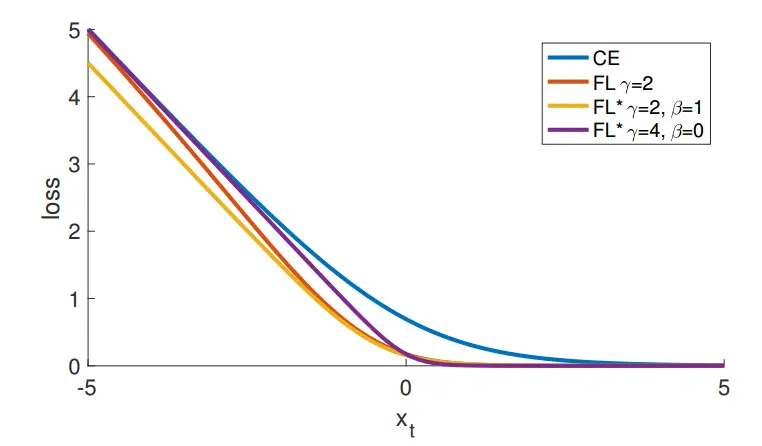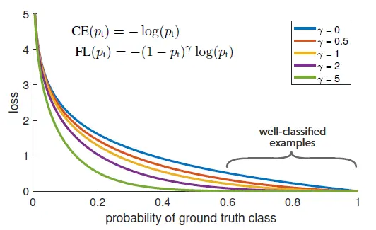 更正式地,我们建议为交叉熵损失增加一个调节因子(1 - pt)γ,其中 γ≥0。于是 Focal Loss 可定义为: