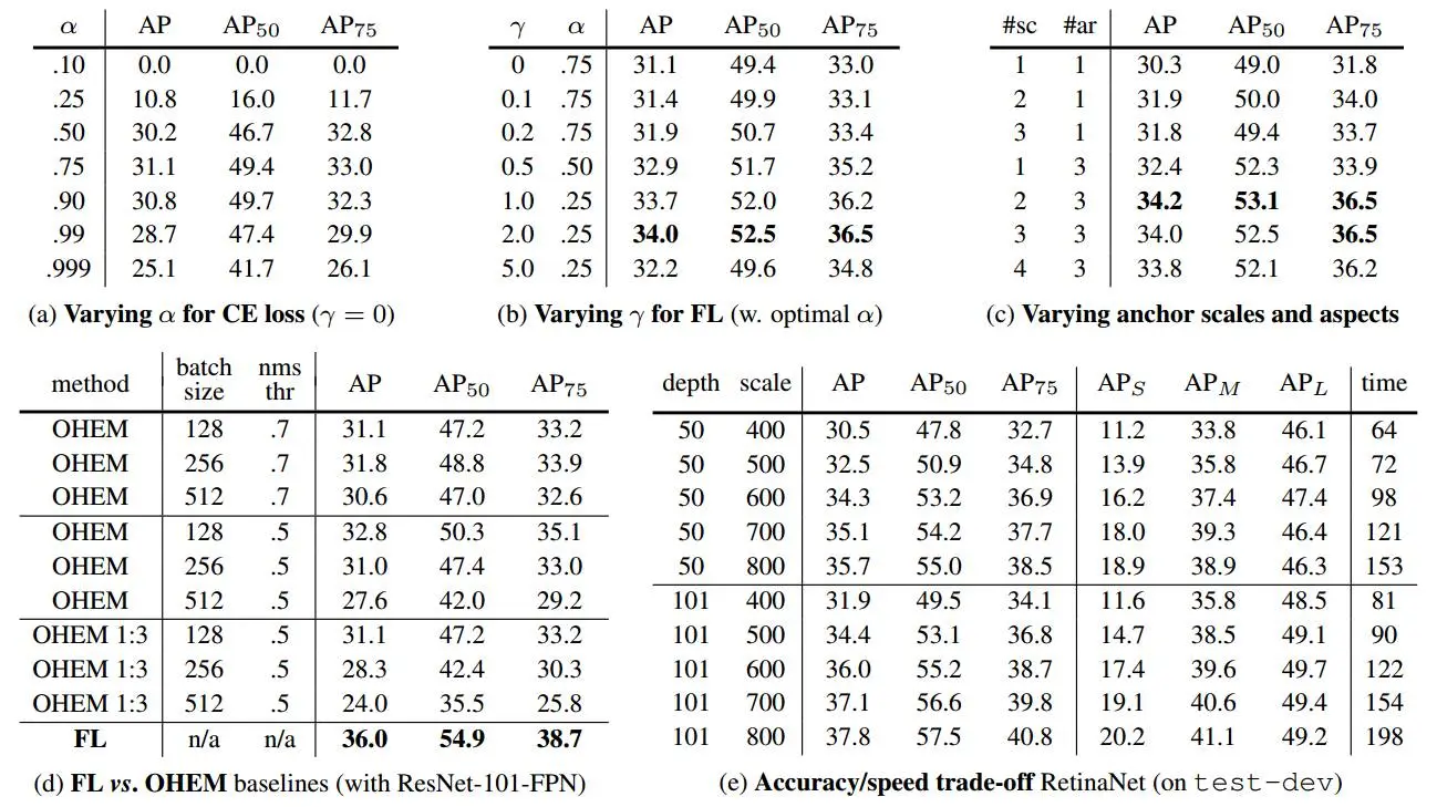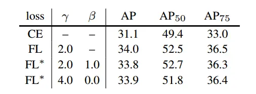 表1: RetinaNet 和 Focal Loss 剥离试验(ablation experiment)