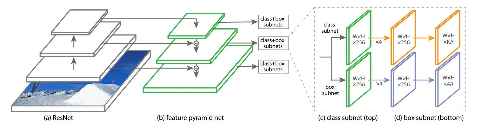 RetinaNet 是由一个骨干网络和两个特定任务子网组成的单一网络。骨感网络负责在整个输入图像上计算卷积特征图,并且是一个现成的我卷积网络。 第一个子网在骨干网络的输出上执行卷积对象分类;第二个子网执行卷积边界框回归。如下图所示。