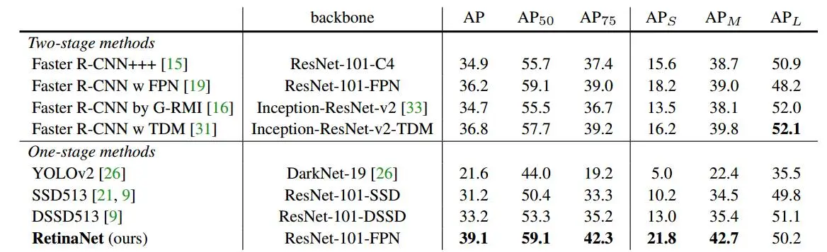 试验证明,Focal Loss 函数可以使我们训练出准确度很高的 one-stage 检测器,并且在性能上超越使用抽样启发法或困难样本挖掘法等以往优秀方法训练出的 one-stage 检测器。最后,我们发现 Focal Loss 函数的确切形式并不重要,并且证明了其他实例(instantiations)也可以实现类似的结果。