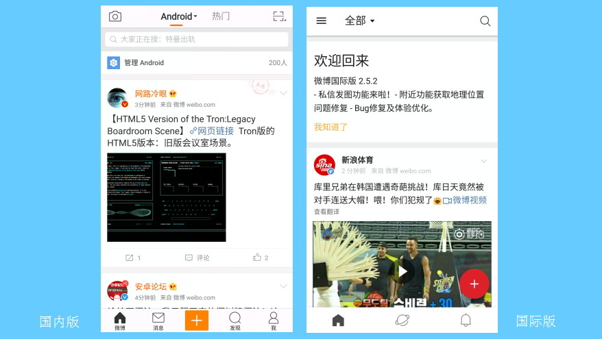 第二、国内版和国际版。这一点也算是国内特色,我 π 的选题箱中早早躺着这样的选题:「国际版本和国内版本 App的区别与优劣」,国内应用开发厂商的出海策略,往往是带来某某国际版,用以区分在国内发布的软件版本。国内外有所区别的 Apps 同样可视为另一种精简版形式。为什么这么所,对比微博应用国内外版本的 App 界面: