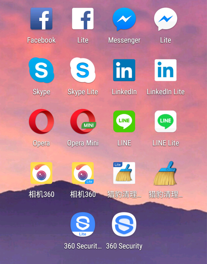 - 精简版应用都有小标标志。Lite 是区分常规版与精简版最为明显的标志之一,Opera mini、UC mini 可能是稍微有点创意的厂商,至少名字上不跟风。