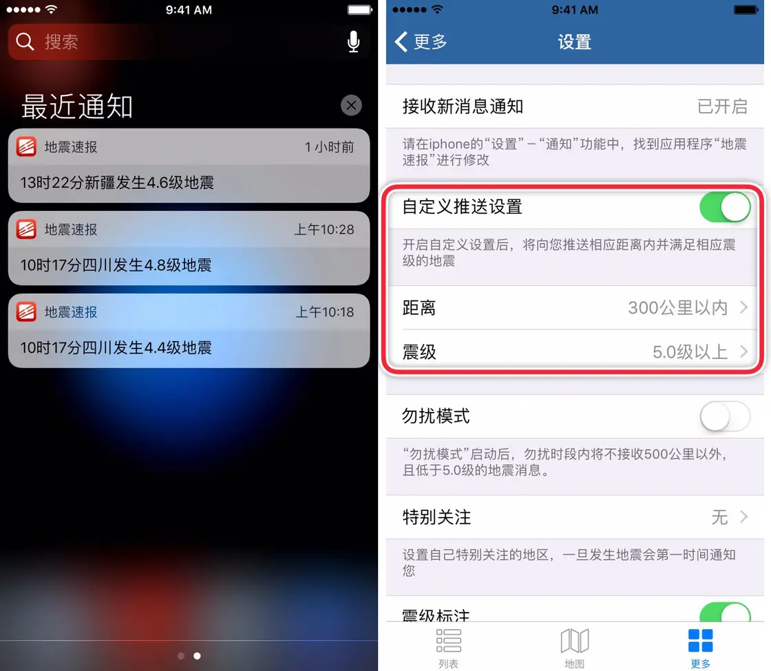 地震速报的第一个特点就在于它的「速」字,它能第一时间地把信息推送到你的设备上。默认设置的情况下,它设定的是全国范围内的全部地震,这样无疑会过于频繁,我们可以将提示推送的条件设为「300 公里以内,5 级以上的地震」。