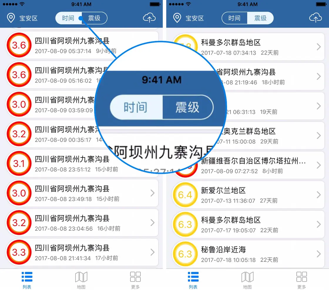 这是这款 App 的另一个特点。在操作界面的顶部有「时间」和「震级」两个标签,可以让你根据需求来显示地震。尤其是「时间」这个标签很有帮助,可以让我们实时了解余震情况。