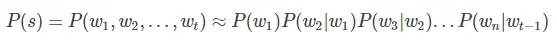 上面的语言模型的参数空间太大而且数据稀疏,导致在实际中基本无法使用。所以我们需要一个假设,某个词出现的概率只与它前面的一个或几个词有关,这个假设就是马尔科夫假设。有了它问题就变简单了,某个句子出现的概率就可以用下面表示(这里假设某词只与前面一个词相关)。