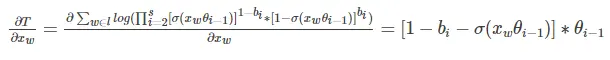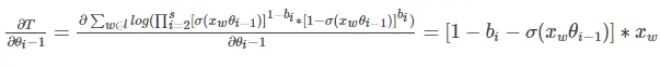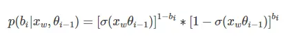 设w为某个词,w前后若干个词用$w_m$表示,二叉树总共有s层,设从根节点到w节点经过的节点的参数为$\theta_1,\theta2,...\theta{s-1}$,比如“每天”经过的参数为$\theta_1,\theta_2$,再设从第二层节点到w节点经过的节点的编码为$b_2,b_3,...,b_s$,则w的条件概率为,