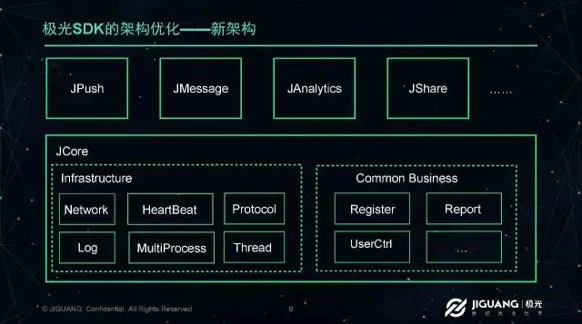 JCore负责核心通用的功能,上层SDK各自在JCore之上运行自有业务,使结构更加清晰,利于拓展共享资源,减少重复动作,针对性做基础优化更加方便。