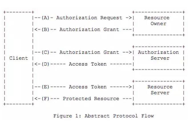 (A)用户打开客户端以后,客户端要求用户给予授权。(B)用户同意给予客户端授权。(C)客户端使用上一步获得的授权,向认证服务器申请令牌。(D)认证服务器对客户端进行认证以后,确认无误,同意发放令牌。(E)客户端使用令牌,向资源服务器申请获取资源。(F)资源服务器确认令牌无误,同意向客户端开放资源。