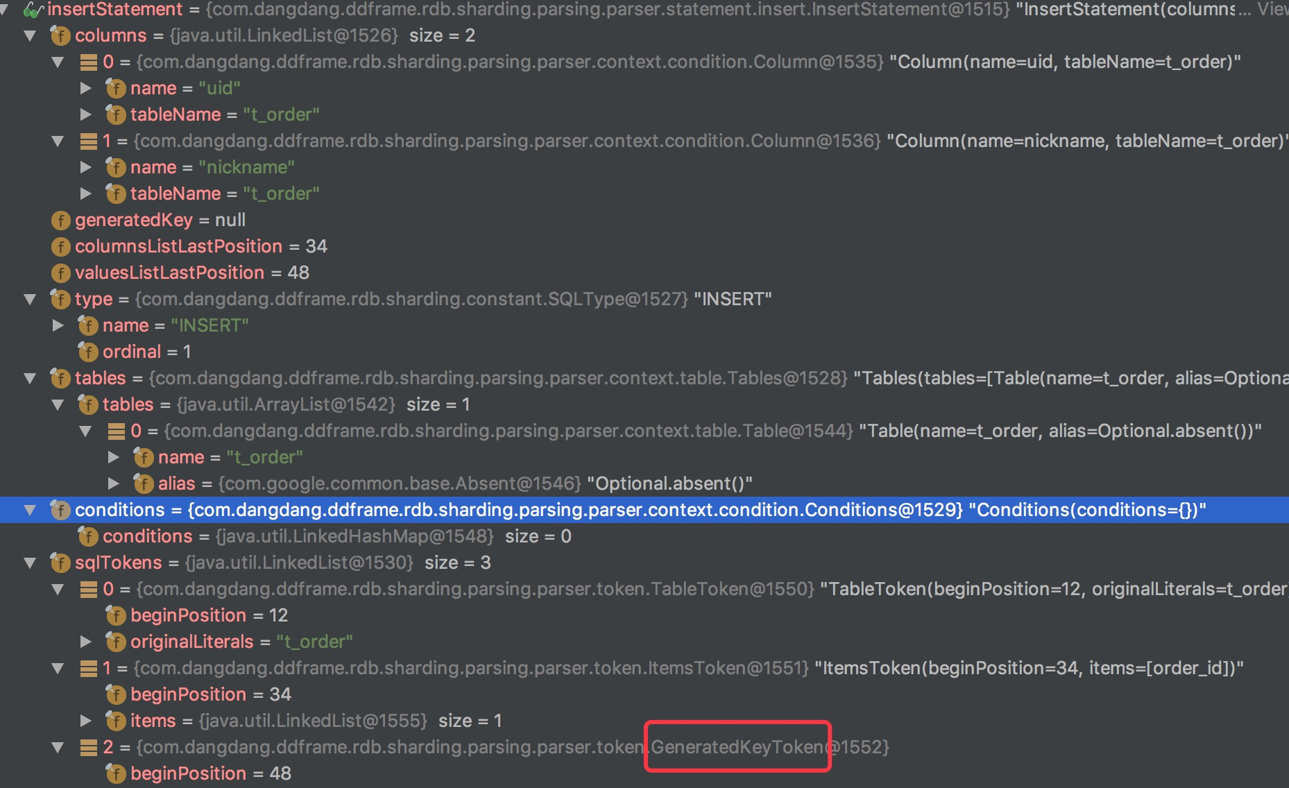 }我们来看下 INSERT INTO t_order (uid, nickname) VALUES (?, ?) 的解析结果: