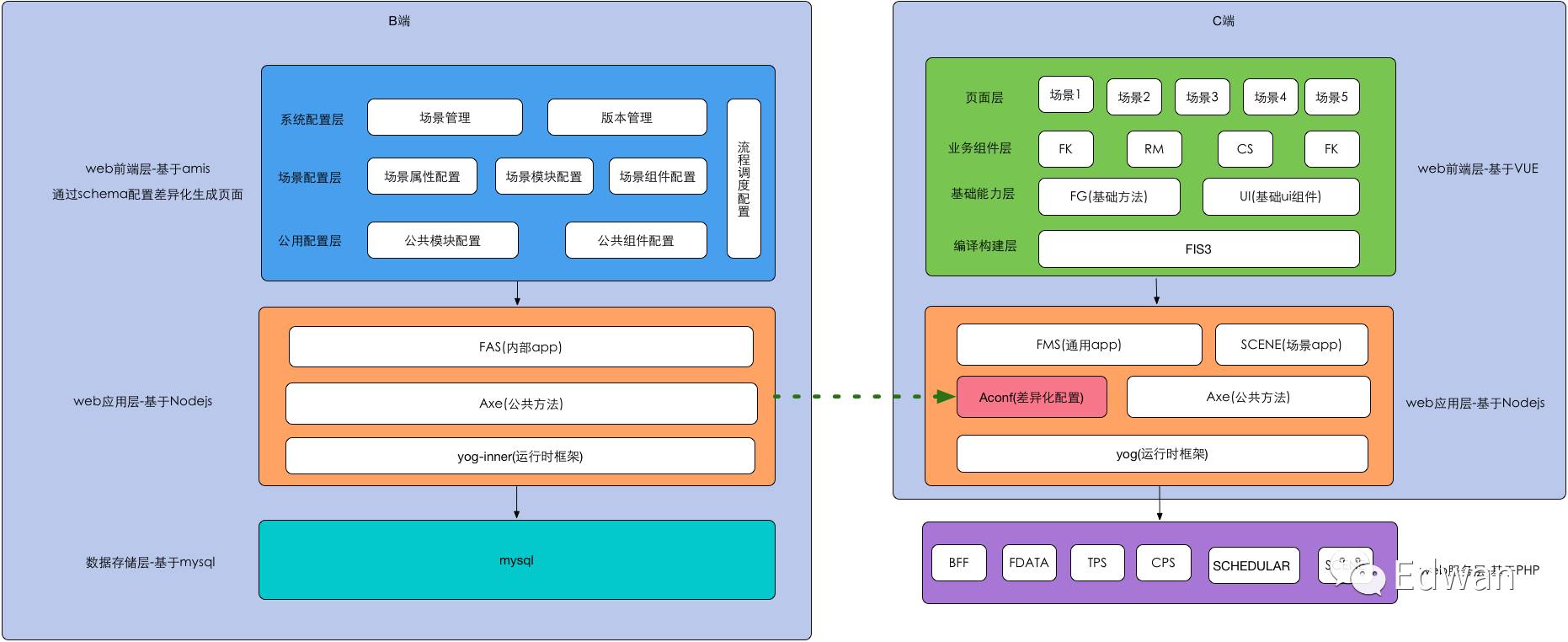 去年做了半年的组件化方案,今年其实一直在做平台一体化的工作,先抛出咱整体的架构,后面会每个模块详细阐述下,我们的业务主要分成B端和C端,B端是可视化的生成差异化配置,这个配置文件最终会放在Aconf模块里面,C端基于Aconf配置文件,组件化或者模块化生成页面,整体的思路大概是这样子