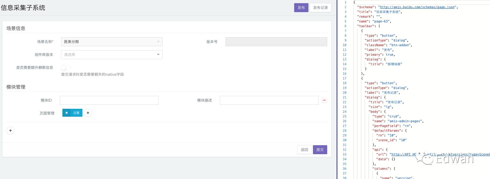 这套方案我们能这么搞,一切的核心都源于:我们有一套基于json-schema配置快速生成页面的系统(公司内部系统Amis),比任何组件化方案都快要快都要好,随时改随时生效,先给FEX的同学点个👍