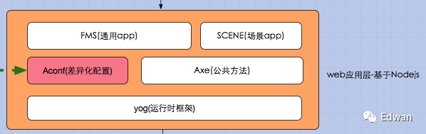 这层主要是基于nodejs给我们业务建模内部系统提供接口处理,对组件、模块、场景、调度引擎的CRUD操作,一部分配置是存储到数据库,大部分是生成配置文件,提交Aconf模块里面,供FMS解析生成页面