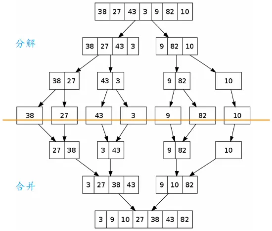 下图来自维基百科:将一个无序的数组自顶向下递归分解,每次二分,直到每份只有一个数,然后将它们逐层合并为有序数组,生成最终的排序结果。(分解与合并是对称的,即分解的过程限定了合并的路径)。
