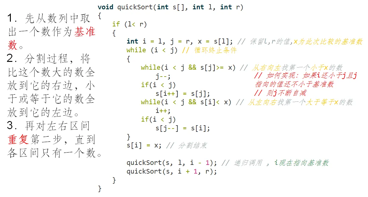 quickSort(s, l, i - 1); // 递归调用 , i现在指向基准数