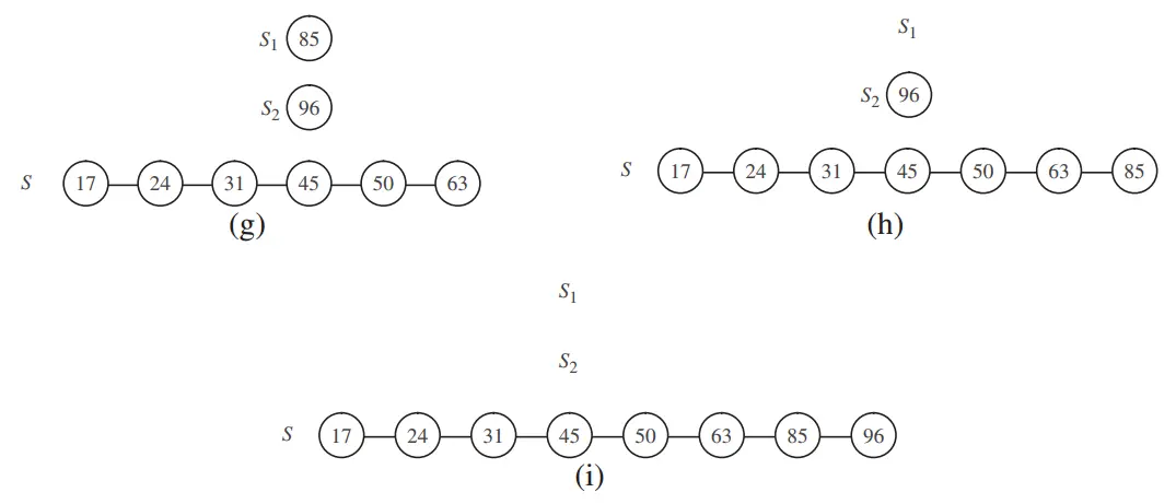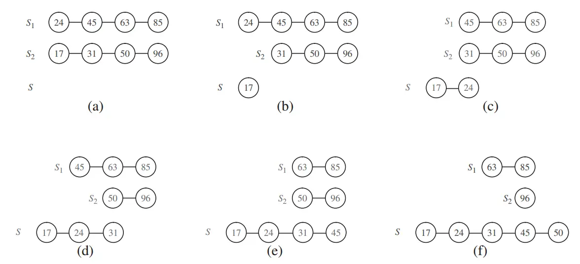 merge()的简单实现,如何合并两个有序数组:对两个数组的队首元素进行比较,取出其中小的放入新数组,对取出该数后的两个数组的队首元素再进行比较,如此循环直到某一数组为空,将另一非空数组中的所有数按原序添加至新数组即可。如对(b)中两个数组S1和S2,比较队首24和31的大小,选择较小的24放入新数组S的17的后面。
