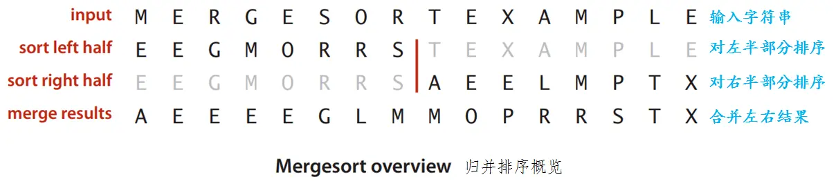 下图来自 《Algorithms - Robert Sedgewick and Kevin Wayne》:对一乱序的英文字母列表排序,将其分为两半,分别对左右两部分排序,然后合并排序结果。