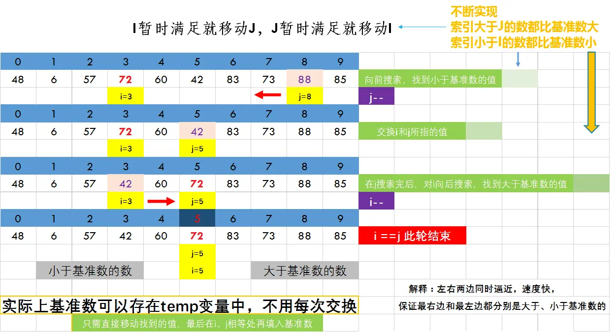 - 进一步,从左右两边逼近,将小于或等于基准数的值移动到基准数左边,且将大于基准数的值移动到基准数右边