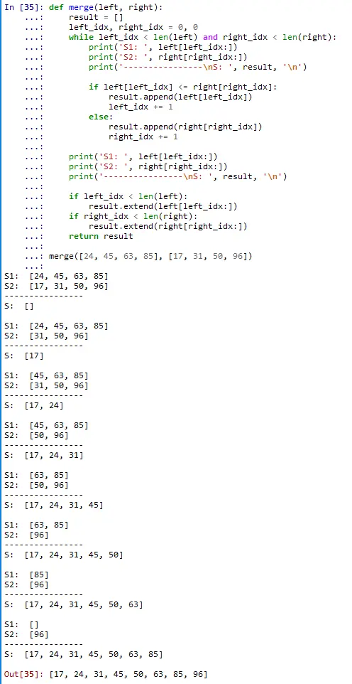 if left_idx < len(left): # 如果S1为非空,将S1中剩余数按原有顺序直接添加在新数组尾部