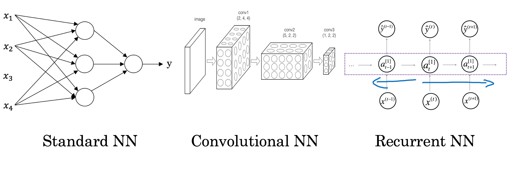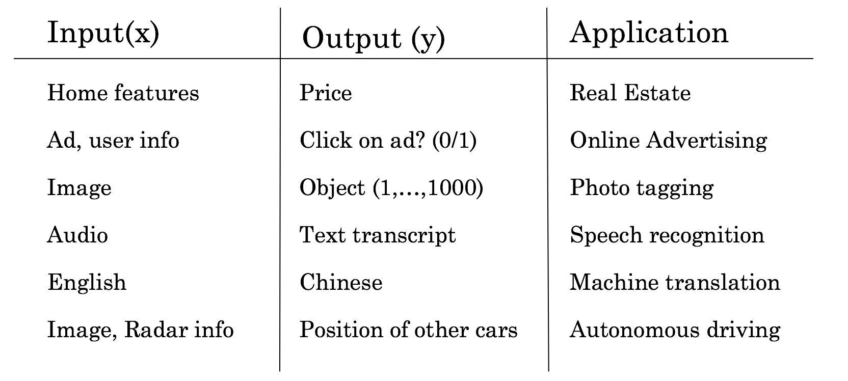 计算机视觉近年来也发展迅速,典型的应用之一即是图片标注;我们可能随机输入一张图片来寻找与它最相近的图片。语音识别则是能够将用户输入的语音数据转化为文字表述;机器翻译则是能将不同语言间的语句进行自由转化,譬如将某个英文段落转化为对应的中文表述。而在自动驾驶中,我们可能会输入某张从雷达中获取的车前图片,来判断路上其他车的相对位置。而对于这些不同的行业领域我们也需要应用不同类型的神经网络,譬如对上文提及的房价预测,我们就可以使用标准的神经网络;而对于图片应用则会优先考虑使用卷积神经网络(CNN)。