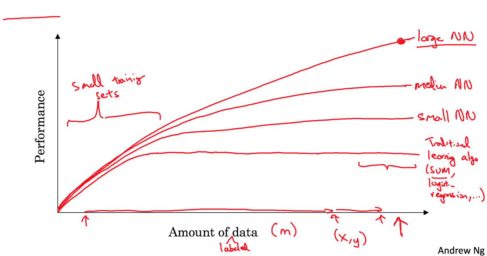 对于支持向量机、Logistics 回归这样经典的机器学习算法而言,在数据量从零递增的初始阶段,其性能会不断提升;不过很快就会触碰到天花板,此时性能很难再随着数据集的增长而提升。而伴随着移动互联网时代的到来,我们能够从网站、移动应用或者其他安装在电子终端设备上的传感器中获取到海量的数据;这些数据在开启大数据时代的同时也为深度学习的发展提供了坚实的基础。我们在上图中也可以看出,越是大型的神经网络随着数据量的增加,其性能提升的越快,并且其性能天花板也是越高。