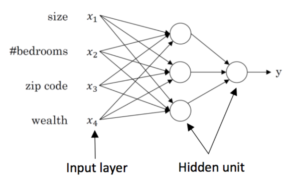 如上图所示即是最简单的单元神经网络,而复杂的神经网络即是由无数的神经元分层连接堆叠而成。譬如实际的房屋价格会由尺寸、卧室数目、所属区域(Zip Code)以及社区的富裕程度影响。我们理想的神经网络即是能够自动帮我们构建隐层(Hidden Units),即输入单元之间的关系以进行最好地预测: